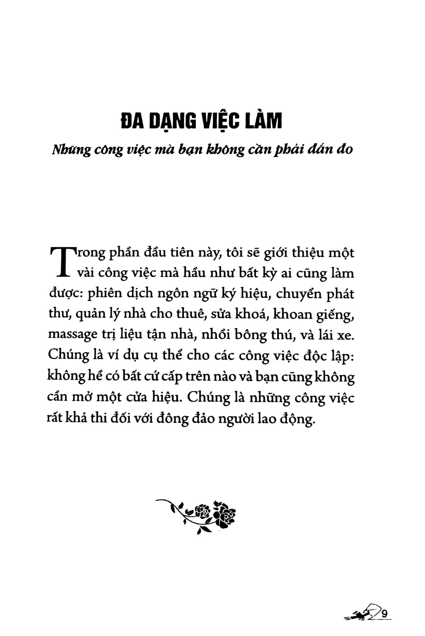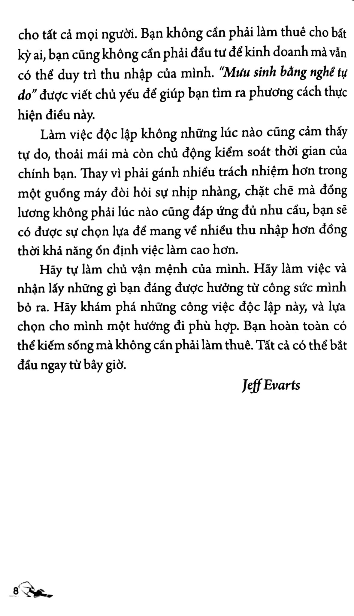 Hành nghề tự do, việc làm thoải mái kèm theo những thu nhập đáng kể là hướng lựa chọn mới mà sách đã đề cập. Nó sẽ đặc biệt có ý nghĩa đối với những ai đang trong tình trạng thất nghiệp, hoặc muốn rời bỏ công việc hiện tại của mình mà vẫn duy trì được mức thu nhập. Những lời khuyên của tác giả Jeff Evarts rất thực tế, hữu ích và thú vị. Hầu hết mọi người có thể chọn một hoặc hai trong số các ý tưởng và biến chúng thành cơ hội kiếm tiền.
